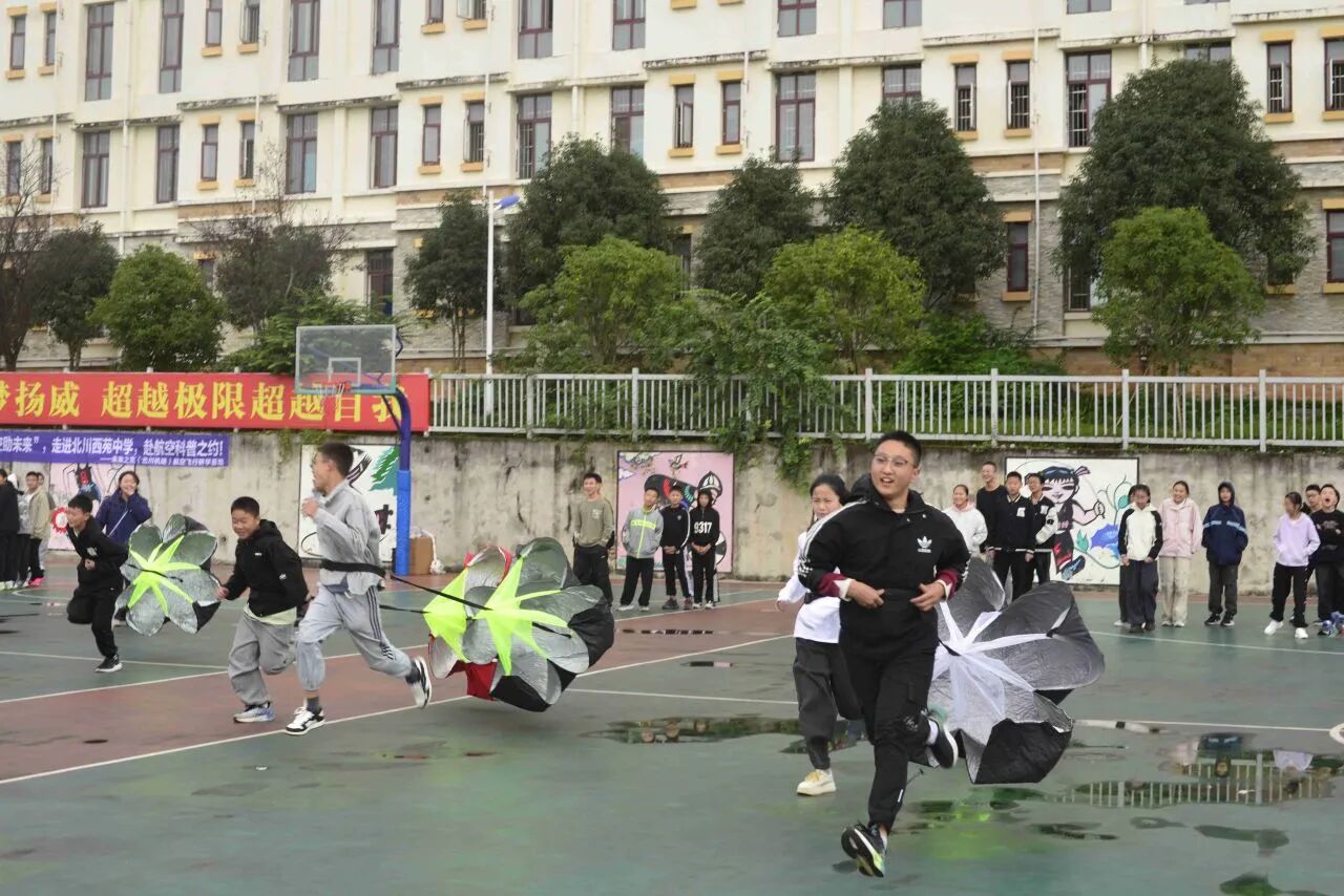 同学们被分成不同小组,将等比例缩小的“减速伞”背在身上,在跑道上进行折返跑竞技。当小小的伞衣在身后打开,奔跑的同学们立刻感受到一股强大的 “迟滞感” ,这种与空气阻力直接对抗的体验既新奇又充满挑战。这场特别的赛跑,不仅比试速度,更考验了同学们在阻力下控制身体和平衡的能力。现场笑声、加油声此起彼伏,大家在快乐的竞技中,深刻理解了降落伞如何通过空气阻力为航天器、飞行器减速的原理。