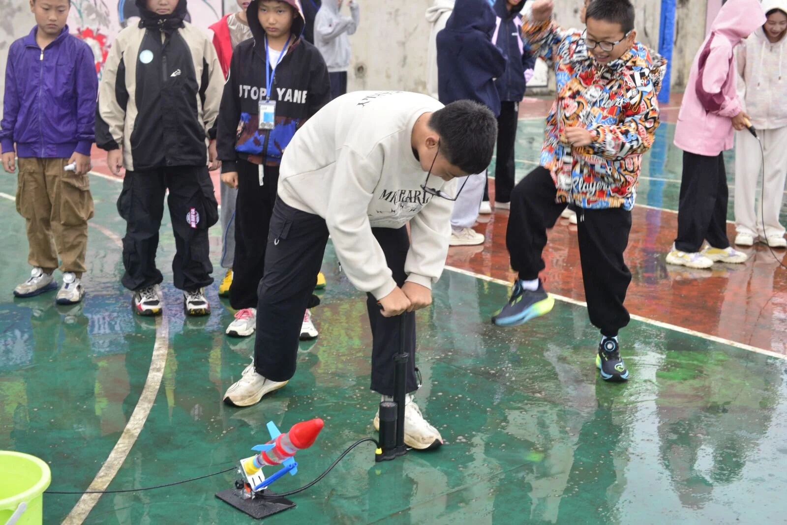 同学们在教员指导下组装、加压并发射水火箭。随着“嘭”的一声,火箭拖着水汽尾焰直冲蓝天,牛顿第三定律——作用力与反作用力原理在这一刻得到了最直观、最有趣的验证,现场惊叹声与欢呼声不断。