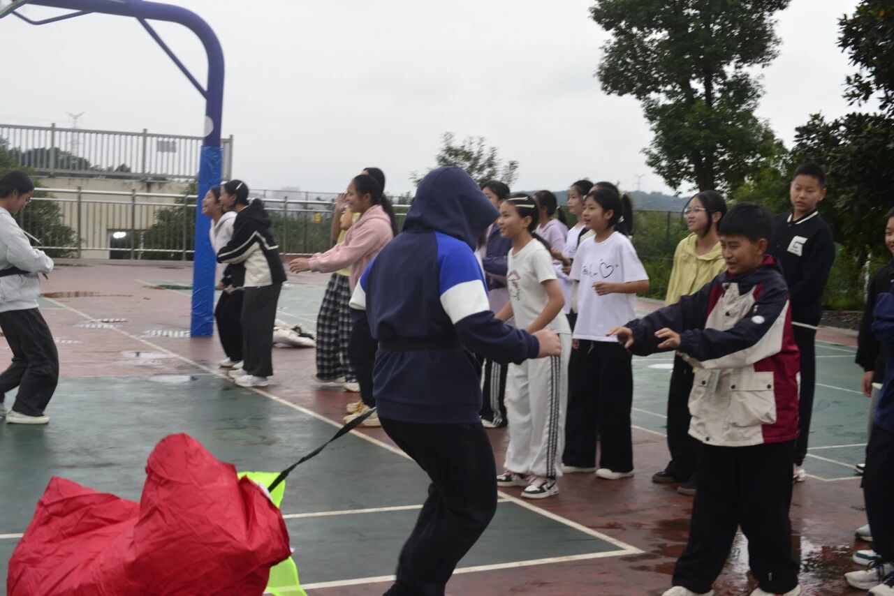 同学们被分成不同小组,将等比例缩小的“减速伞”背在身上,在跑道上进行折返跑竞技。当小小的伞衣在身后打开,奔跑的同学们立刻感受到一股强大的 “迟滞感” ,这种与空气阻力直接对抗的体验既新奇又充满挑战。这场特别的赛跑,不仅比试速度,更考验了同学们在阻力下控制身体和平衡的能力。现场笑声、加油声此起彼伏,大家在快乐的竞技中,深刻理解了降落伞如何通过空气阻力为航天器、飞行器减速的原理。